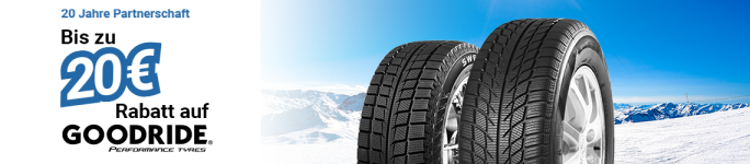 Wir feiern 20 Jahre Partnerschaft mit Goodride und Sie feiern mit! Sichern Sie sich bis vom 07.11.2022 bis zum 20.11.2022 bis zu 20 Euro Rabatt beim Kauf von Reifen der Marke